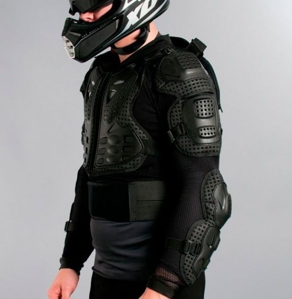 Экипировка для кросса и эндуро больше всего напоминает панцирь черепахи – литая непробиваемая защита в области груди и спины, смягченная внутренней эластичной подкладкой. Налокотников нет, но хорошо организована защита шеи. Существуют модели на пневматических амортизационных элементах с эффективным рассеивающим действием для повышенного уровня защиты от ударов. В некоторых моделях предусмотрены съемные элементы (например, наплечники, спинная часть).
