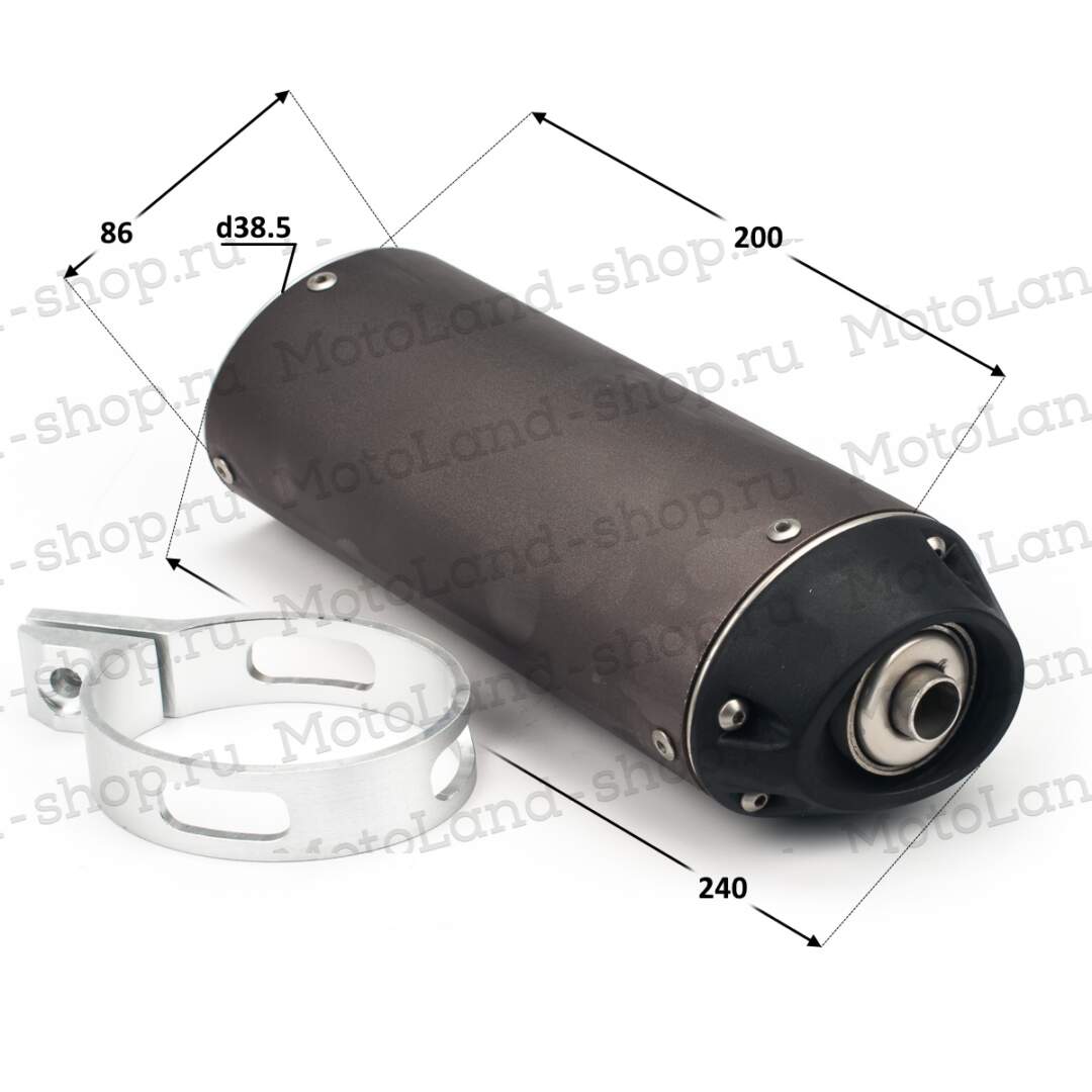 Этот глушитель представляет собой компактный модуль для выхлопной системы мотоцикла, , предназначенный для моделей вроде эндуро или мотокросса (например, Yamaha TTR или аналогичных). Он имеет цилиндрическую форму с зауженным выходным отверстием. Длина корпуса около 25-30 см (судя по шкале на фото), диаметр входного отверстия примерно 5-6 см, выходное — чуть уже, с черным карбоновым или пластиковым наконечником для эстетики и снижения нагрева. В комплекте металлический хомут (зажим) из нержавеющей стали с болтовым креплением, который используется для фиксации глушителя на выхлопной трубе. Внутренняя конструкция, включает перфорированные перегородки или абсорбирующий материал для поглощения шума, обеспечивая баланс между снижением громкости и сохранением мощности двигателя. Это может быть прямоточный тип, судя по дизайну, подходящий для тюнинга — он усиливает звук выхлопа, делая его более агрессивным, но не слишком шумным. Материалы: корпус из легкого металла, устойчивого к высоким температурам. Подходит для универсальной установки на трубы диаметром 38-51 мм. Идеален для улучшения производительности и внешнего вида мотоцикла, с акцентом на долговечность и простоту монтажа.