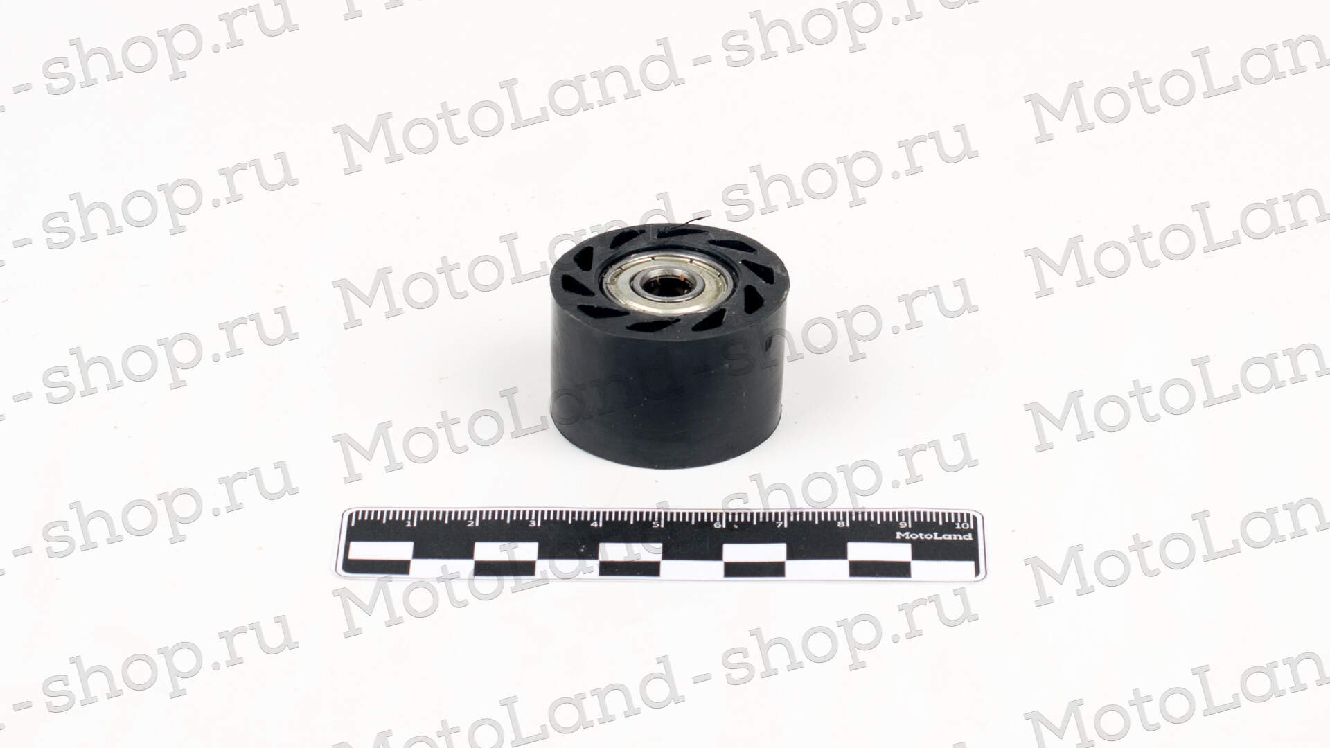 Ролик натяжения цепи, предназначенный для использования в мотоциклах, питбайках или квадроциклах. Это деталь цилиндрической формы с гладкой поверхностью. В центре расположен металлический подшипник, обеспечивающий плавное вращение и минимальное трение. Все размеры указаны на фото