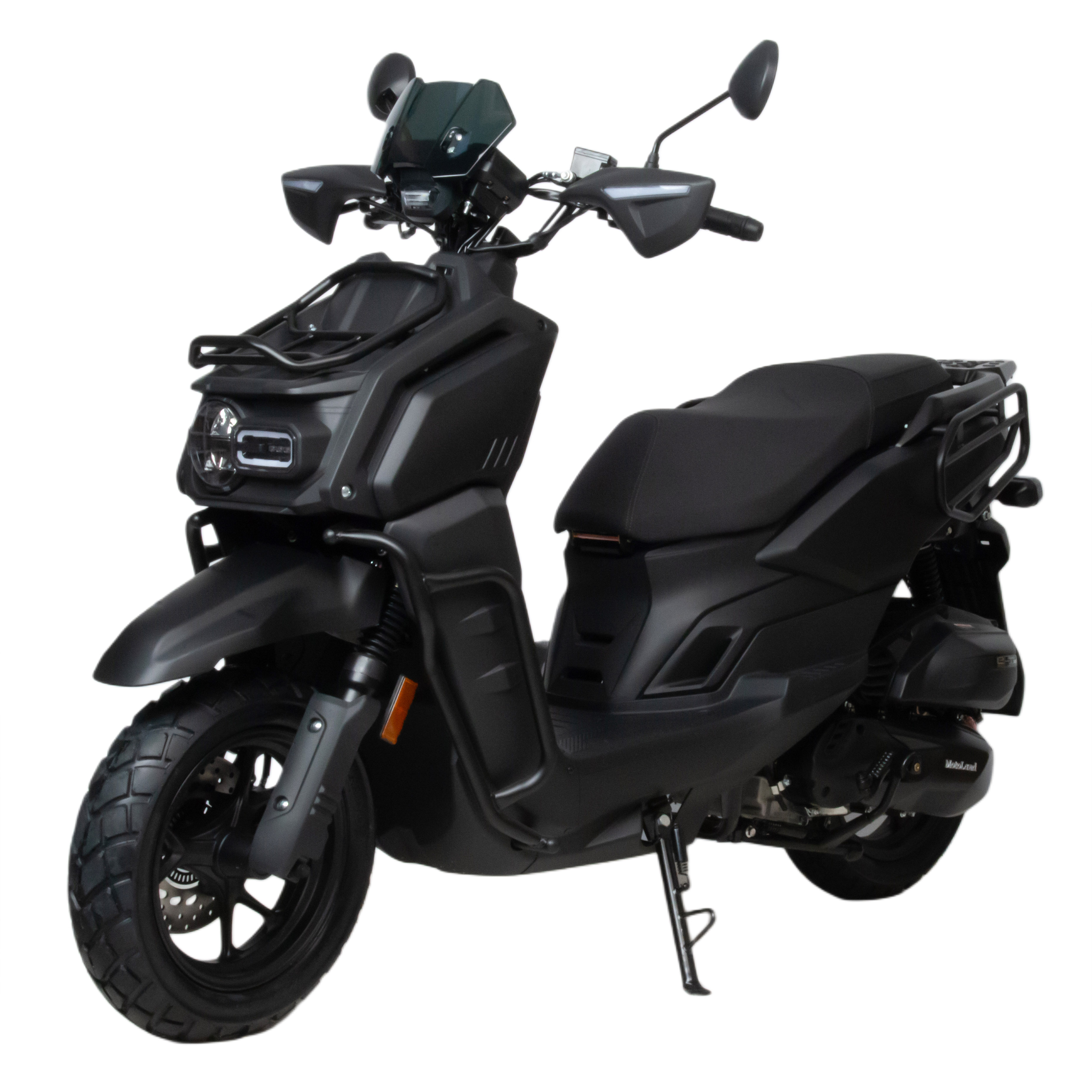 Мощный скутер Motoland Tank 150 — это отличный вариант для загородного катания и поездок на рыбалку: имеет множество дополнительных защит и закрытий, колеса 12" с резиной для поездки по грунтовой дороге и асфальту.