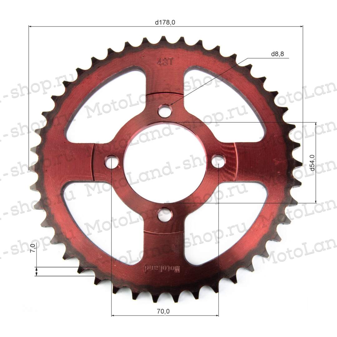 Эта звезда имеет 43 зуба, что позволяет оптимизировать передаточное отношение для достижения баланса между скоростью и тягой в зависимости от модели транспортного средства. Крепление осуществляется через четыре отверстия с диаметром круга центров (PCD) 70 мм, а внутренний диаметр ступицы равен 54 мм, что обеспечивает точную посадку на вал или втулку заднего колеса. Общая конструкция выполнена из прочной легированной стали с термообработкой для повышения износостойкости и сопротивления деформации под нагрузкой.